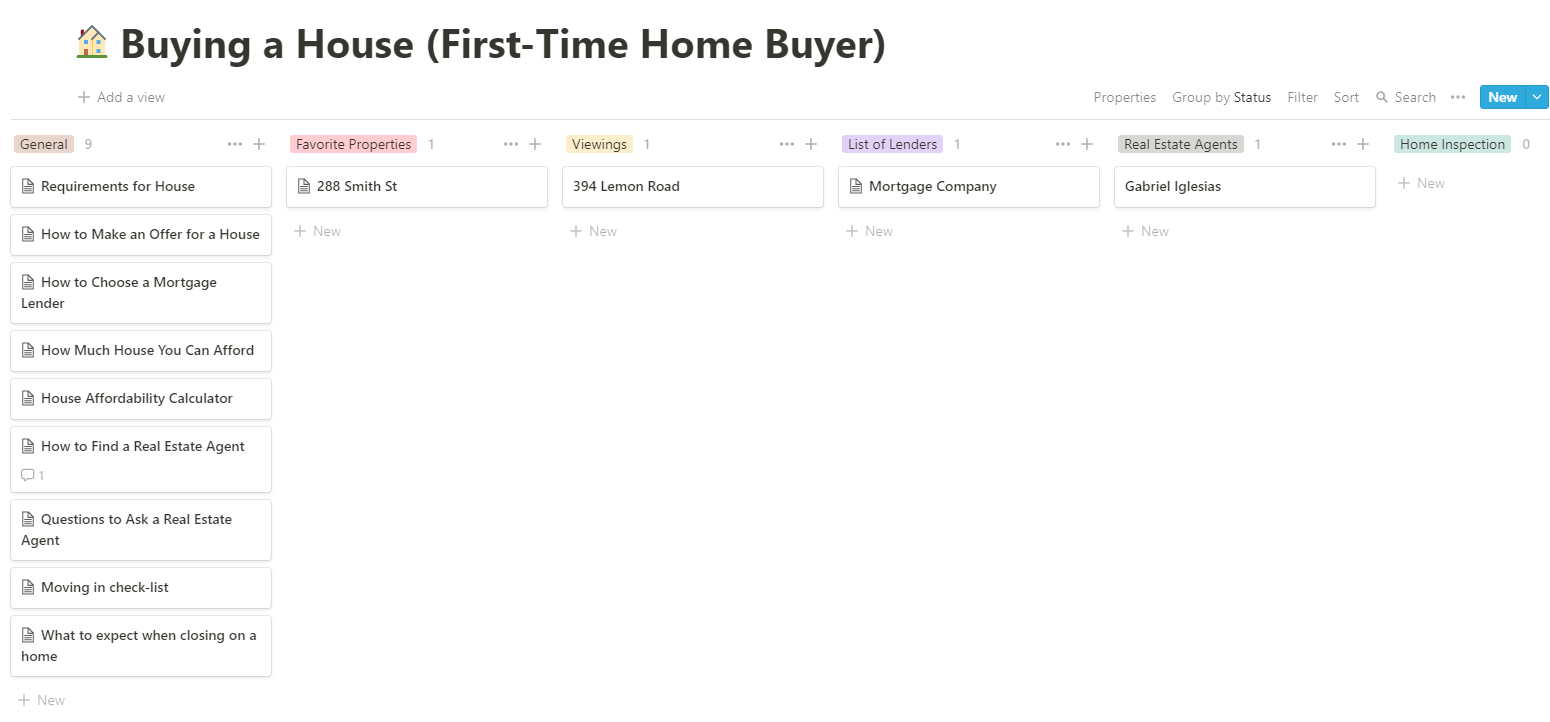 In the notion template, I created 7 columns (General, Favorite Properties, Viewings, List of Lenders, Real Estate Agents, Home Inspections, Closing). In the General section, I added resources such as "How to Choose a Mortgage Lender", "How Much House You Can Afford", and "Questions to Ask a Real Estate Agent". Once you get acquainted with these resources, you will get an overall sense of the homebuying journey. Understanding how much home you can actually afford is important, so definitely spend some time understanding your finances first.