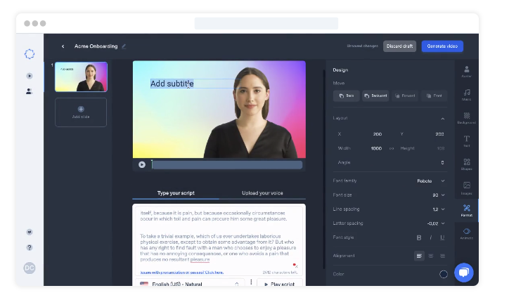 You can choose a library of existing actors and choose a voice that matches the script. You can type in a script and add other components like text, images, and shapes. Then ultimately, you can create the video without editing and you let the AI do its' work.